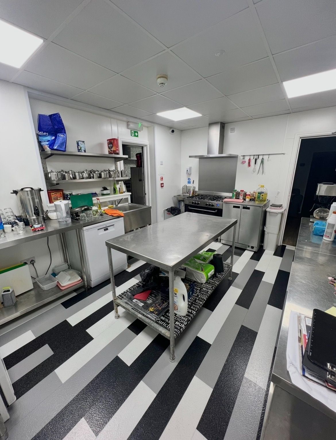 Fitted Kitchen with non-slip flooring, wall and base units and a range of catering equipment and utensils to cater for all guests.