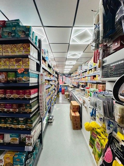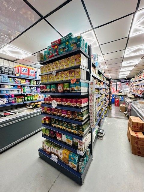 Main Shop with tiled and laminate flooring, shelving to the walls, suspended ceiling and air conditioning.