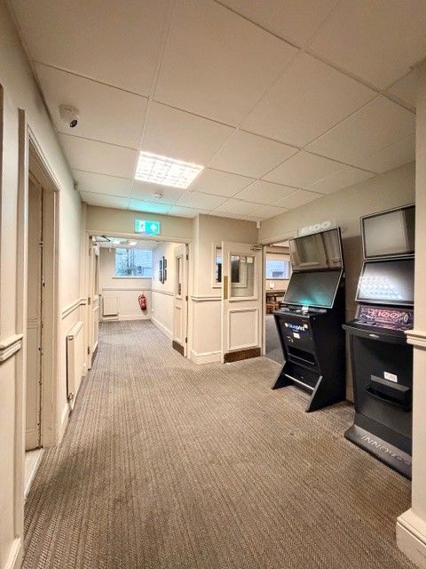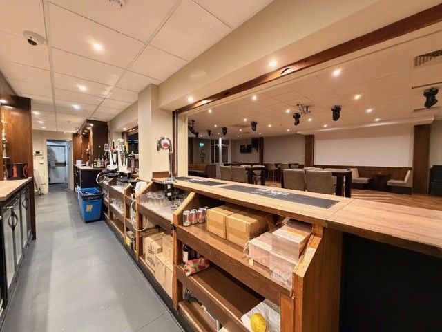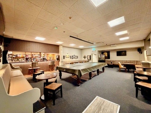 Upholstered seating for 30 patrons, carpet flooring, suspended ceiling, concealed lighting and featuring a full-size Snooker Table and 2 large flat screen TVs.