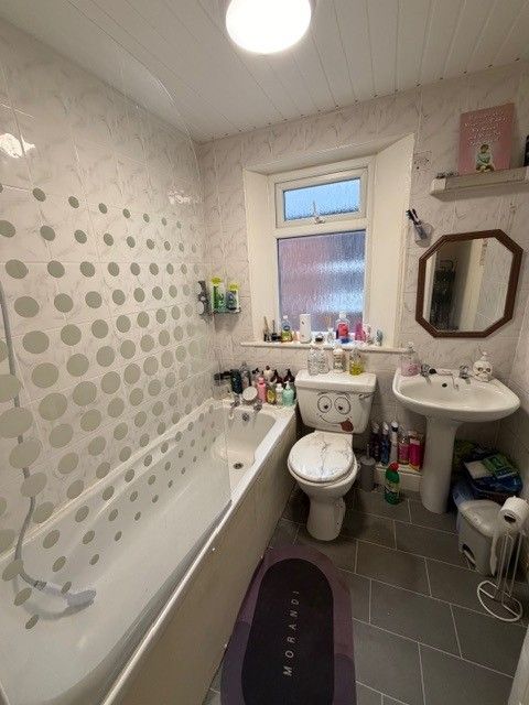 Bathroom (approx. 6’5” x 6’5”) with 3-piece suite comprising bath with shower above, pedestal washed hand basin and toilet.